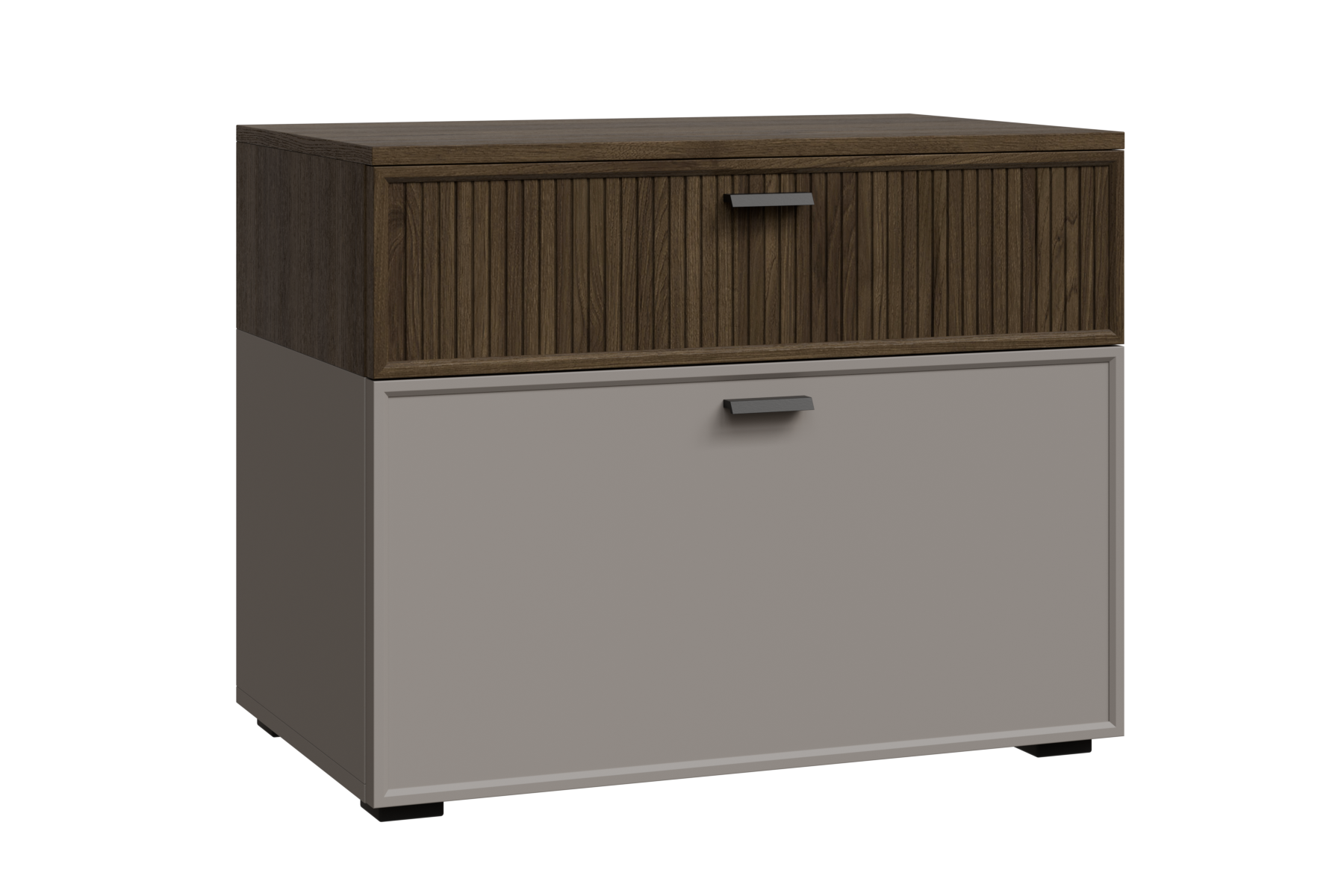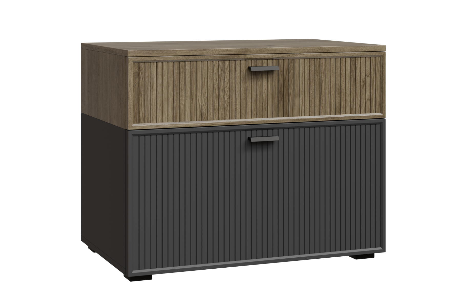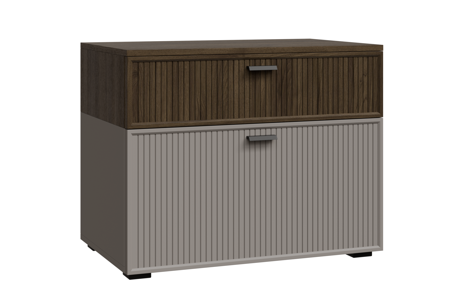 нижний корпус и нижние гладкие фасады Серый Оникс, верхний корпус и верхние ребристые фасады Гикори Джексон светлый
