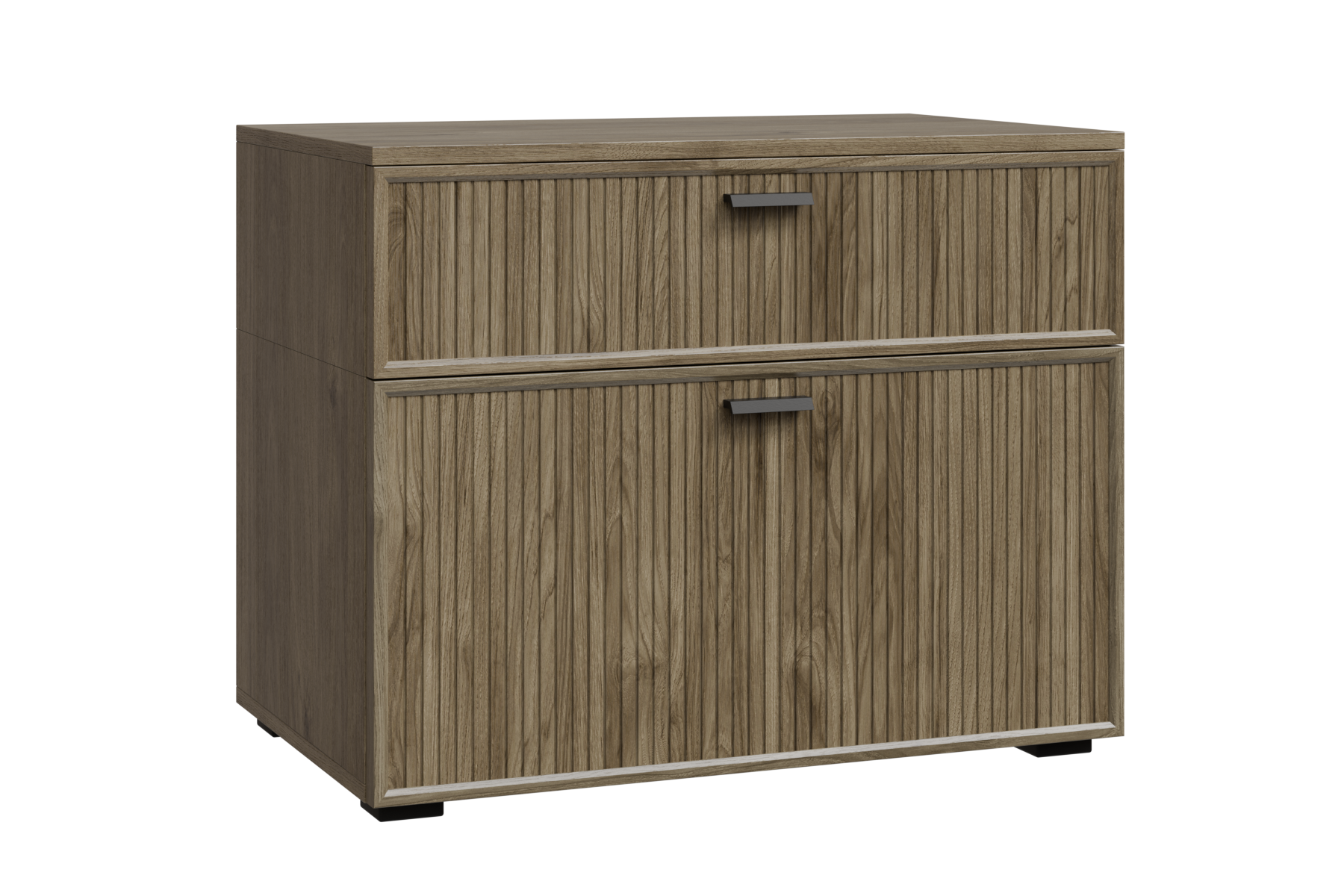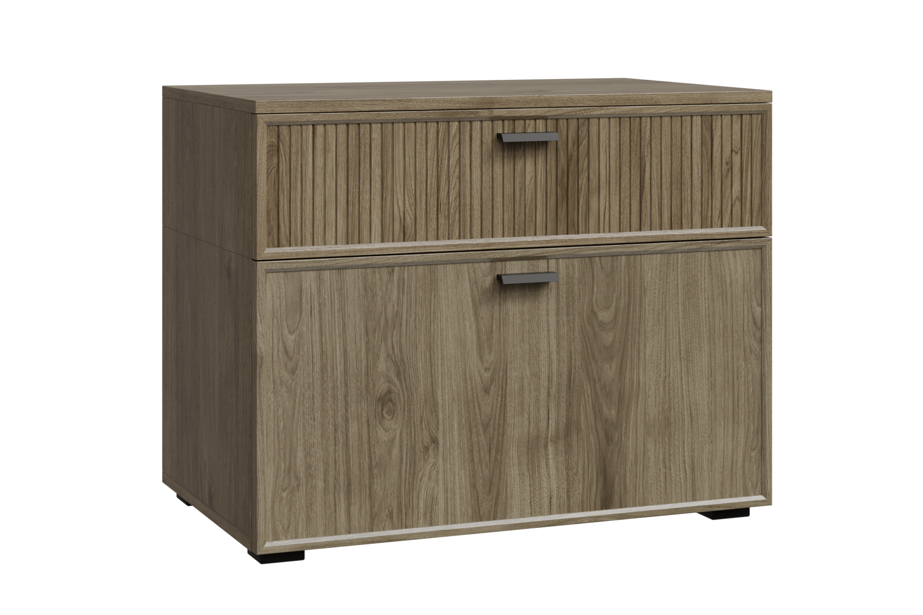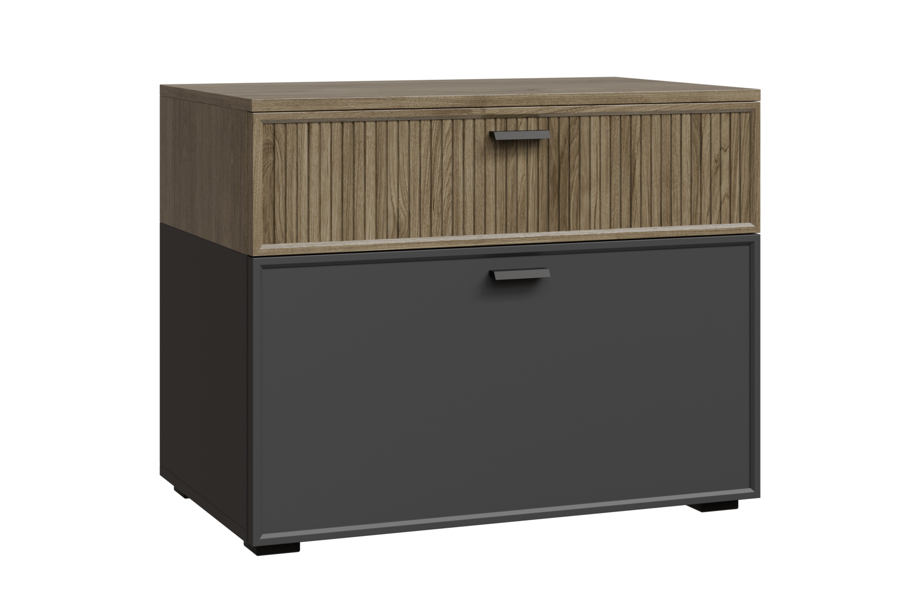 нижний корпус и нижние гладкие фасады Серый Оникс, верхний корпус и верхние ребристые фасады Гикори Джексон светлый