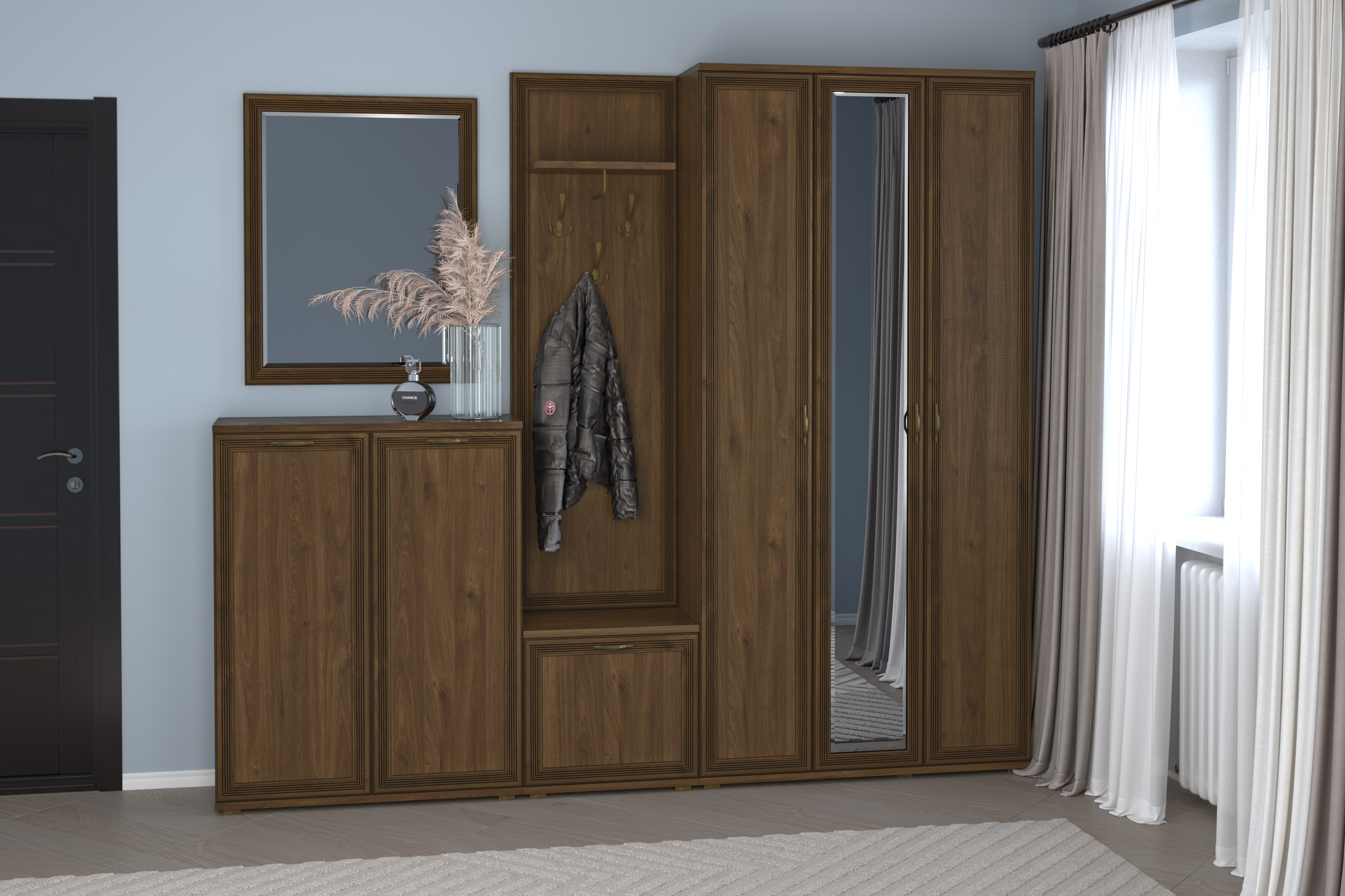 Фасад имеет уникальное сочетание глубокого тиснения и эффекта патины, присущей классическому стилю. Изящество фасада подчеркивает стекло с алмазной гравировкой и фацетом.